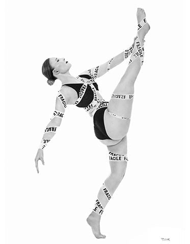 This artwork captures vulnerability and hidden strength. The woman, balancing on one leg in a split, symbolizes our daily struggles. She’s wrapped in tape, boldly labeled „Fragile“ – a tag we often place on ourselves, representing self-doubt and the belief we’re more delicate than we are.